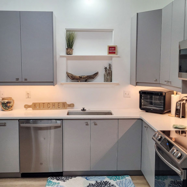 An undermount stainless steel sink was installed to enhance the kitchen’s functionality. Its clean lines and flush design contributed to the kitchen’s modern appearance, while the durable material made it an ideal choice for everyday use. Paired with a contemporary faucet, the sink became a practical yet visually striking feature.