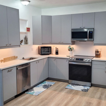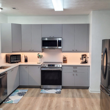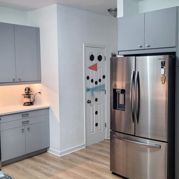 Luxury Vinyl Plank (LVP) flooring was selected to provide both functionality and aesthetic appeal. Its realistic wood-like appearance added warmth and character to the kitchen while offering superior resistance to wear and moisture. The flooring’s rich tones complemented the cooler hues of the cabinets and countertops, balancing the overall design.