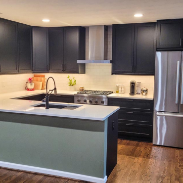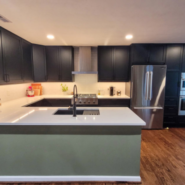The combination of form and function shines here: dark cabinetry with sleek black hardware, balanced by light countertops and backsplash, anchored by the sage green island and tied together with premium appliances. It’s a kitchen where cooking is anything but boring – an inspiring space designed for both everyday living and memorable gatherings.